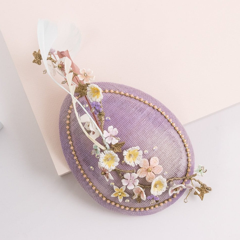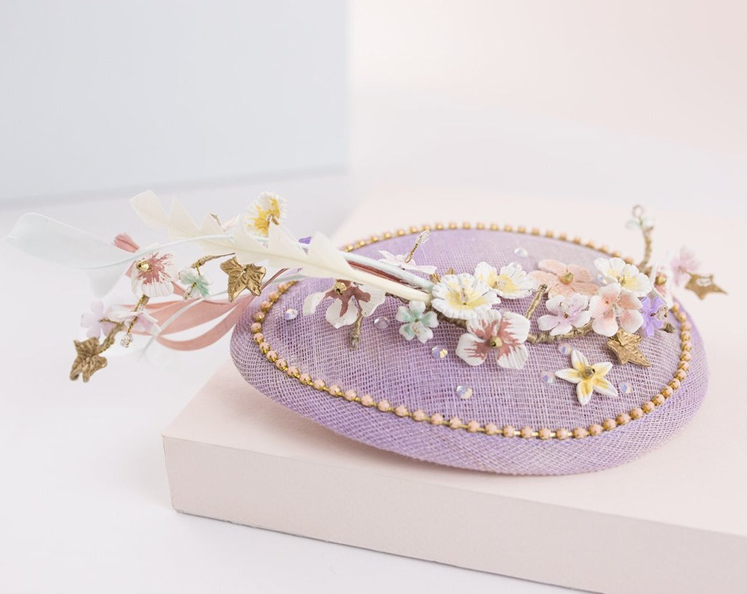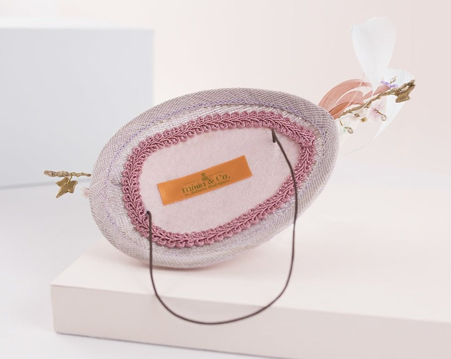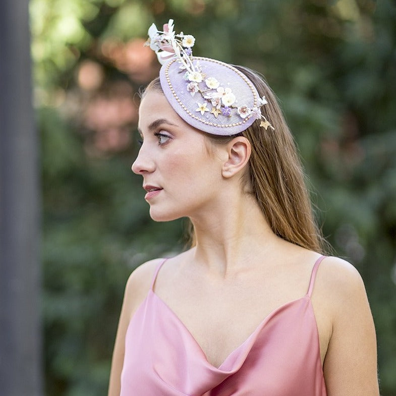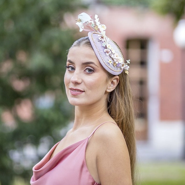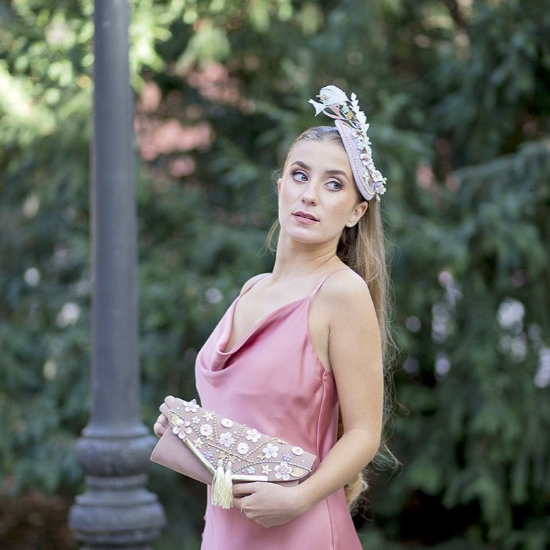 No podríamos adivinar que juntar piedras de fantasía, plumas, cadenas metálicas, fibras de paja natural100% españolas y detalles en porcelana de almidón de yuca, nos fuera a resultar en un tocado de invitada ¡así de alegre y sofisticado!
