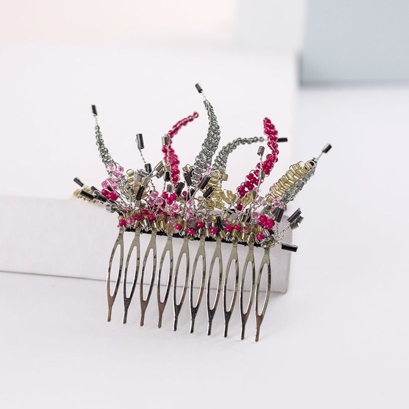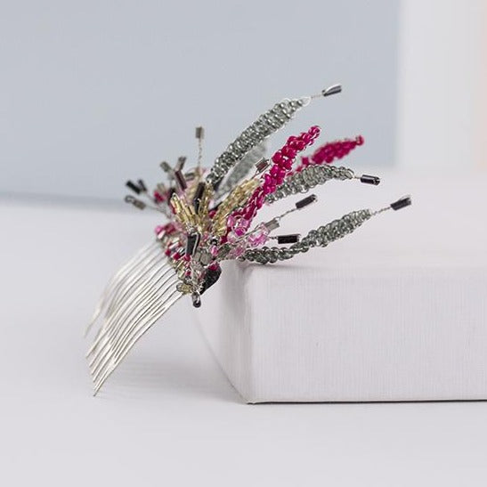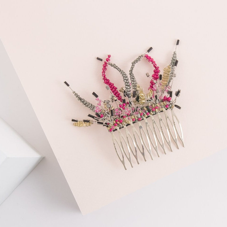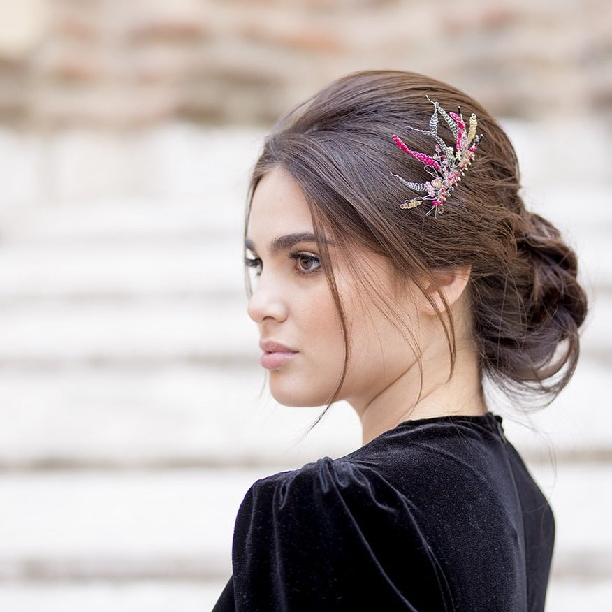 ¿Por qué la proponemos para bodas de tarde?, bueno pues porque los colores fucsia, negro, dorado y plomo, además de su tamaño pequeño y brillo sobrio, la hacen perfecta para cuando las chicas queremos llevar un accesorio en el pelo, que se vea pero que sea discreto.