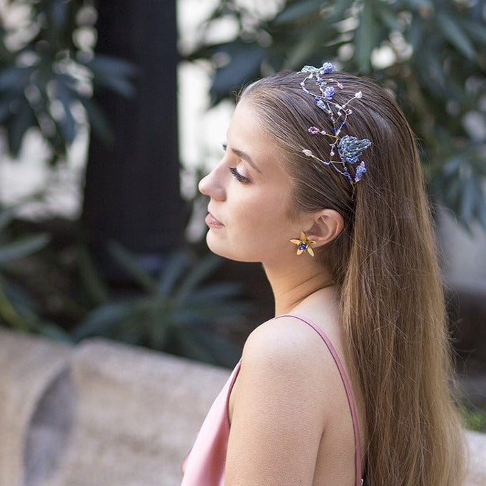 Los aretes flor cao se caracterizan por imitar la forma de la flor del cacao. Están hechos de bronce chapado en oro 24K, adornados con piedra de cristal azul, rosa, negro, beige, verde y marrón tornasol. Estos aretes son populares y versátiles porque se pueden llevar en ocasiones formales e informales, son un perfecto fondo de armario estiloso.