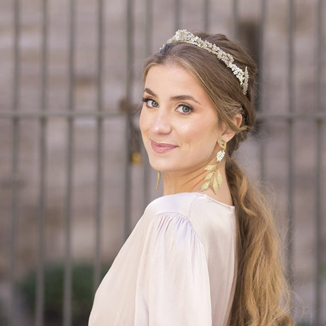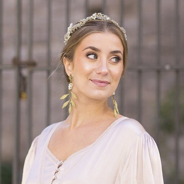 Los pendientes Acacia son de fabricación artesanal con técnicas latinoamericanas y europeas. Están compuestos por un hilo metálico, piedrecillas, nailon y una base de oro goldfilled. Estos pendientes largos tienen un tejido metálico en las cinco hojas que los conforman y un lóbulo sostenedor en forma de rombo.
