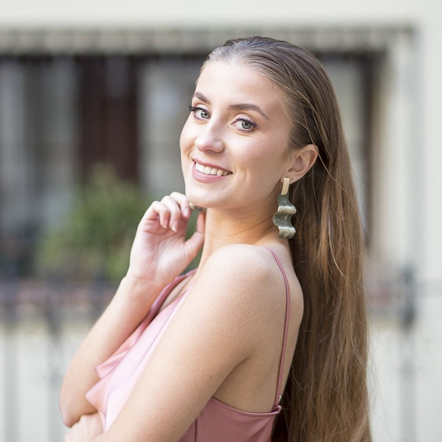 Usamos una base de oro gold filled que previene, en gran medida, las alergias. Va pegada al lóbulo, y el detalle más importante está en la hoja hecha en porcelana de almidón de yuca, pintada a mano en color verde musgo.