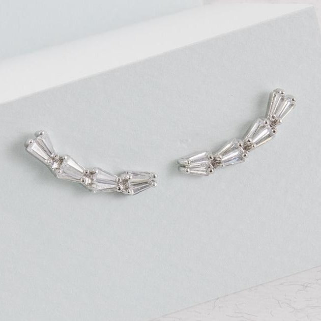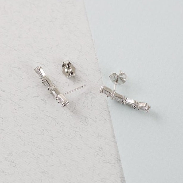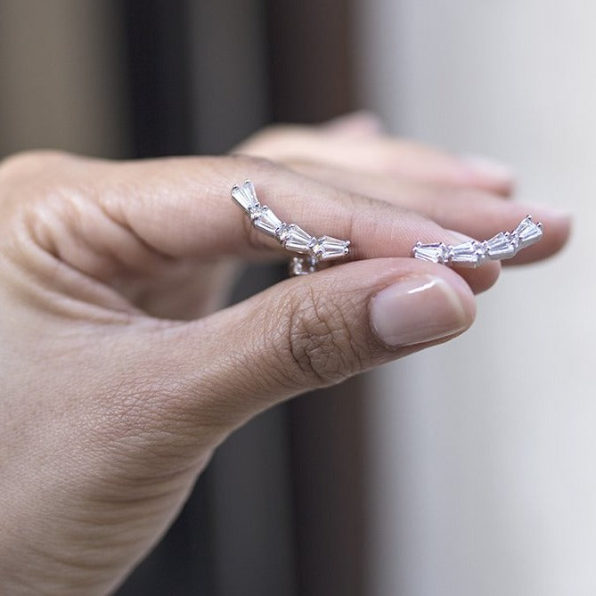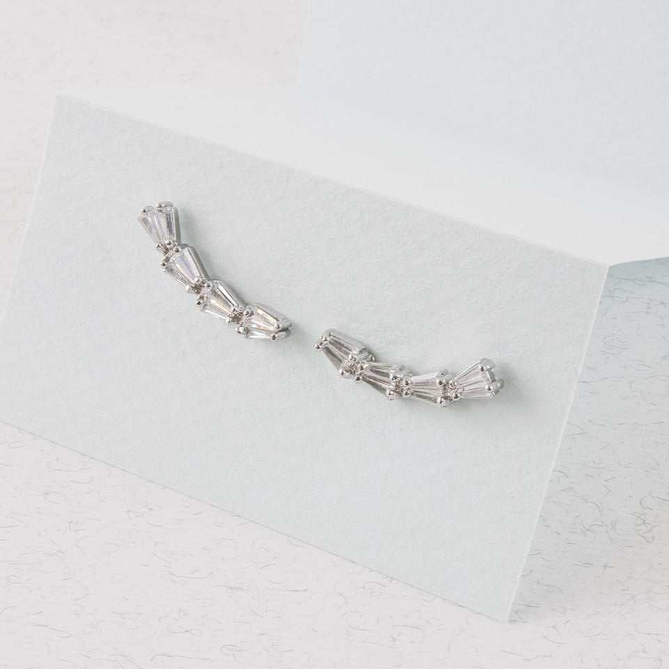 Estos pendientes de novia están pensados para una Novia o invitada clásica y moderna. Se trata de un diseño de tamaño pequeño que, comienza en el lóbulo y se extiende ligeramente por la curva de la oreja en forma de curva trepadora. El color plata junto a los circones brillantes dan esa elegancia que tanto nos gusta. Este diseño hace parte de la selección de pendientes de fantasía, fabricados en latón con baño de rodio no solo para proteger el envejecimiento de las piezas sino porque tiene características antialérgicas.