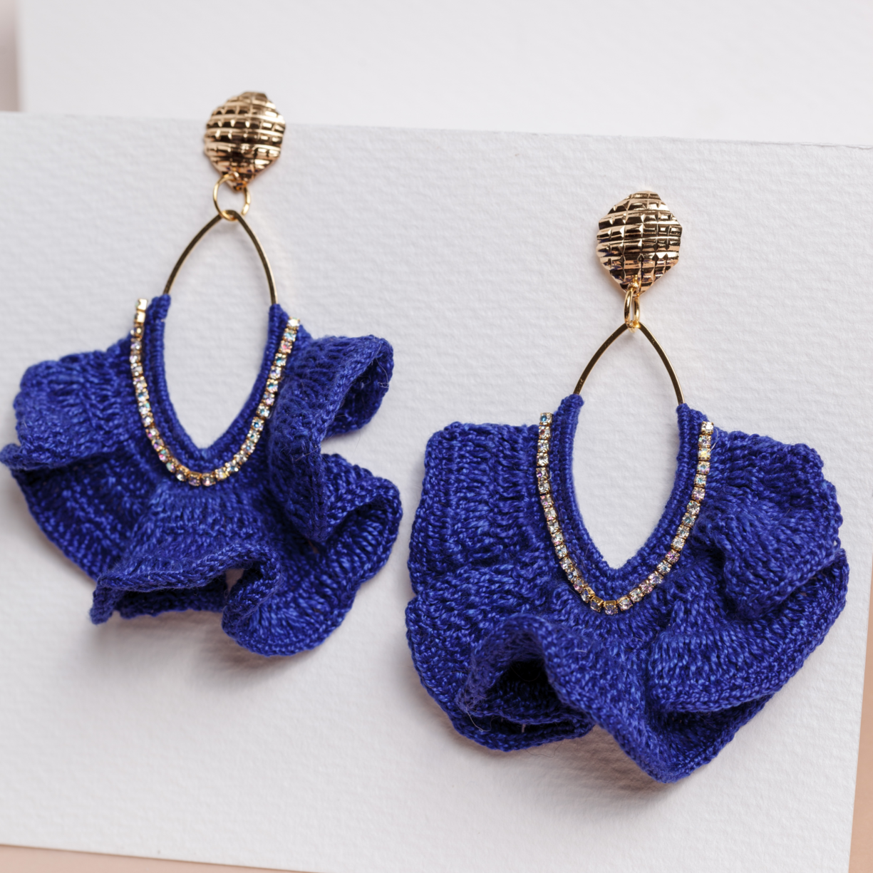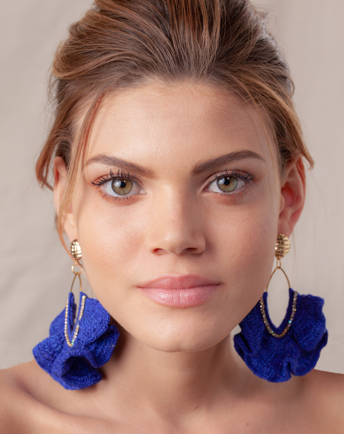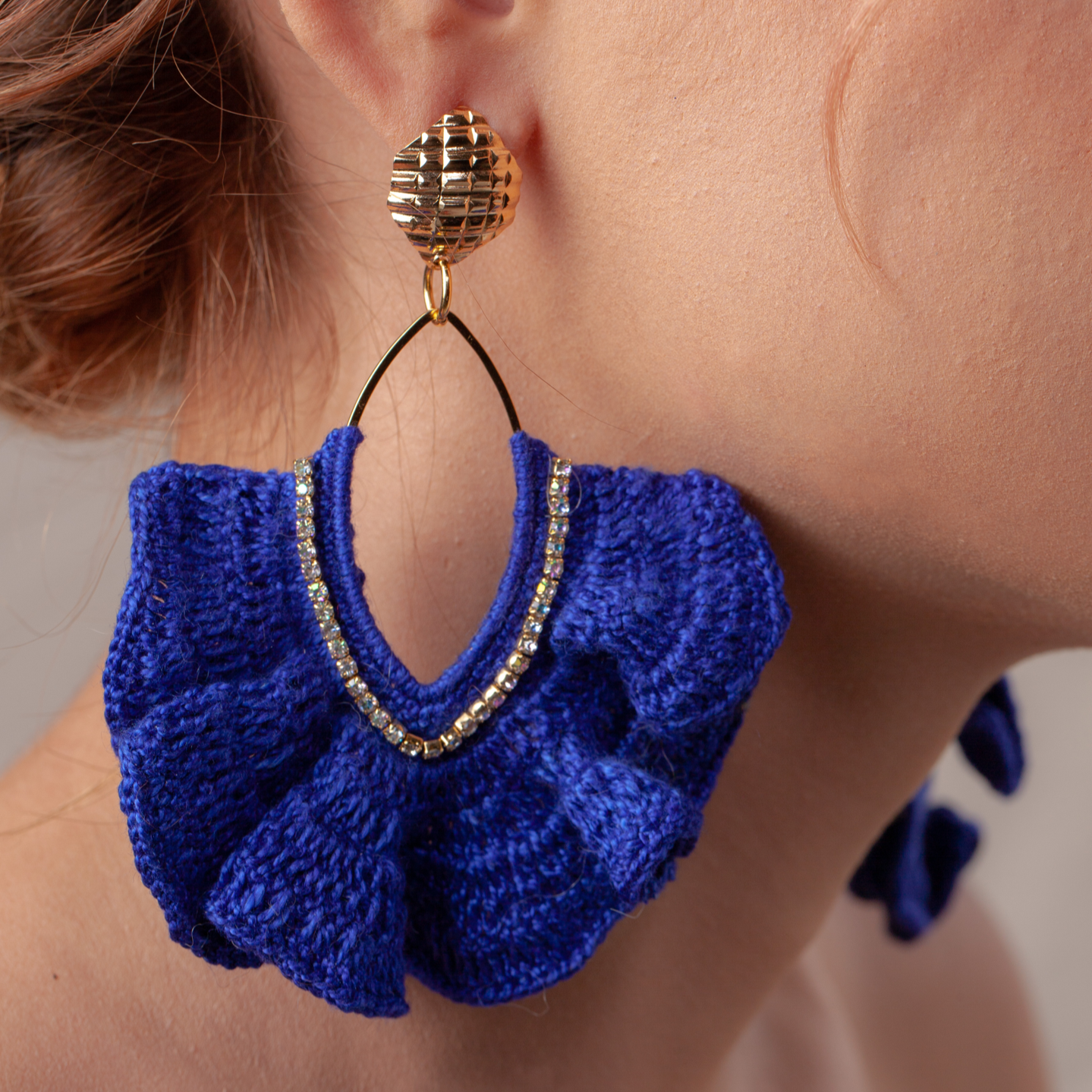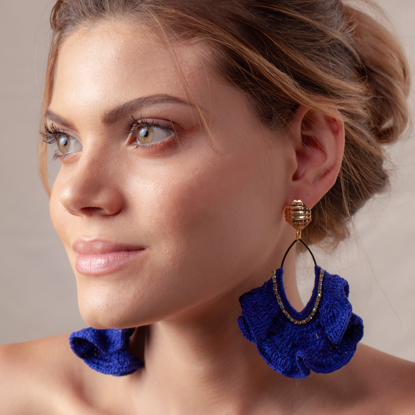 Usamos una base de oro gold filled que previene las alergias, va pegada al lóbulo, y el detalle más importante está en el tejido a mano color azul y el bordado.
