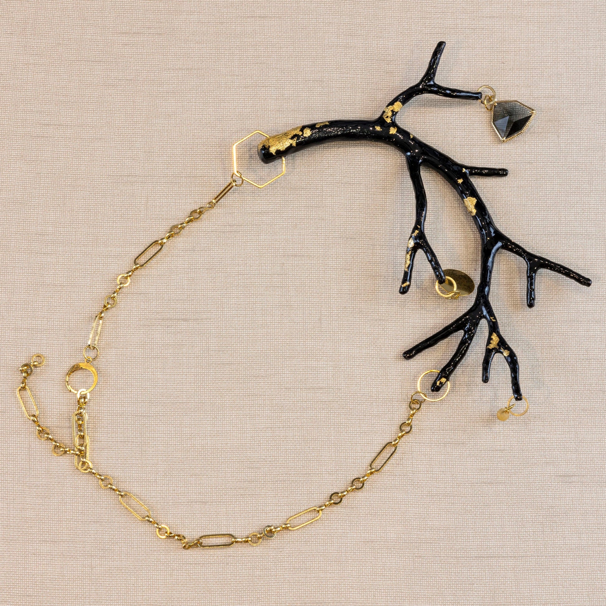 El collar de raíz está hecho de manera artesanal con materiales sostenibles. Una base de orfebrería de bronce bañada en oro y cubierto con porcelana de almidón de yuca pintada mano con laminilla de oro sobrepuesta.