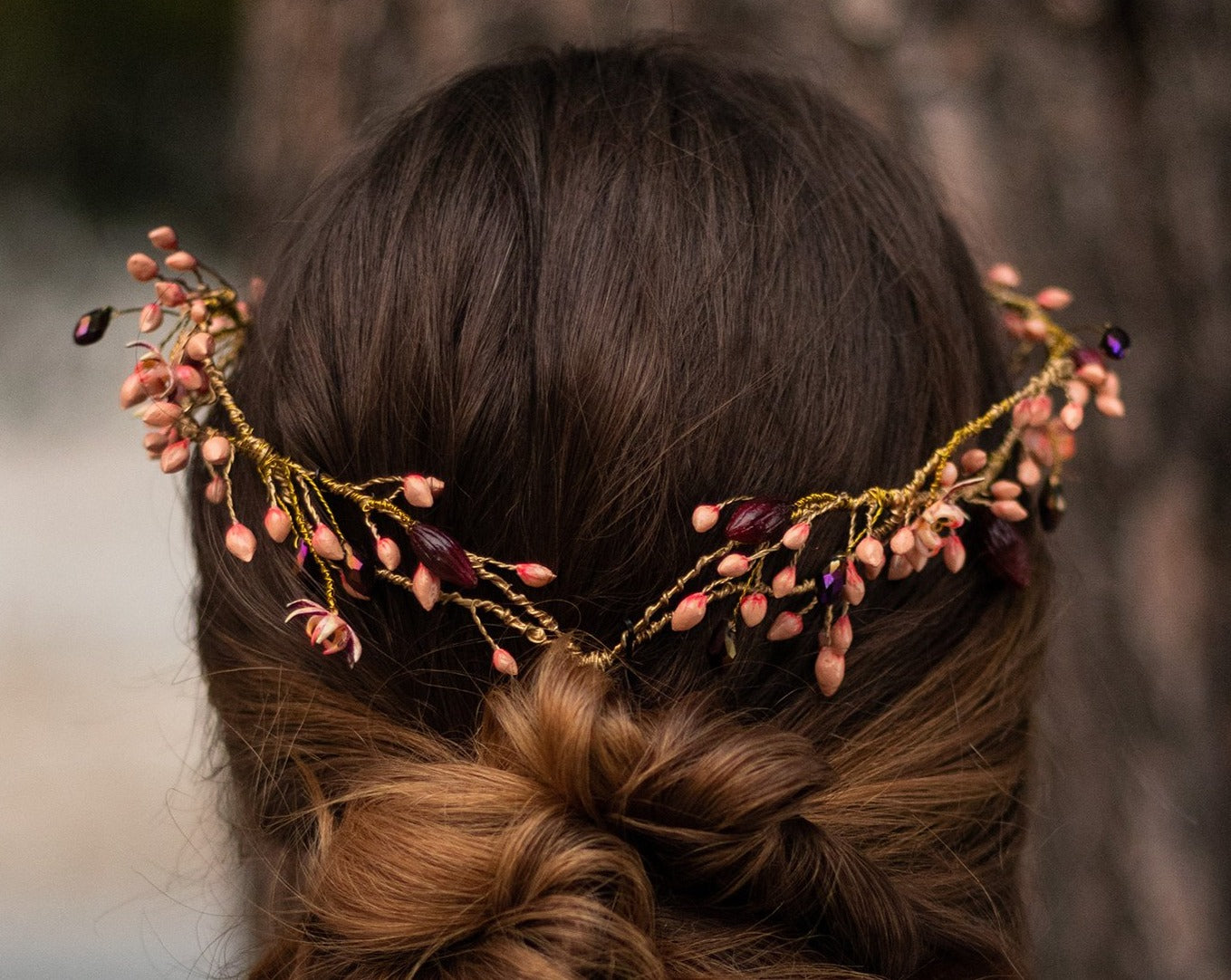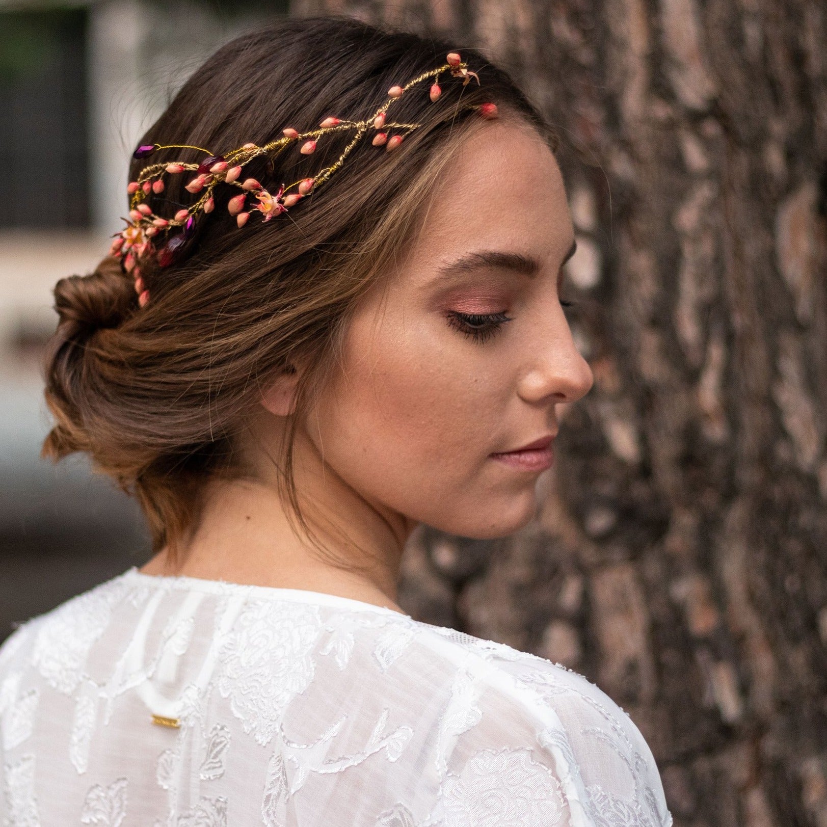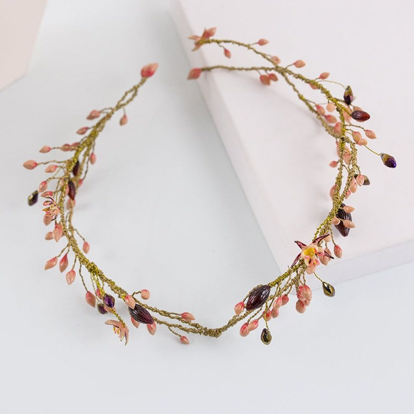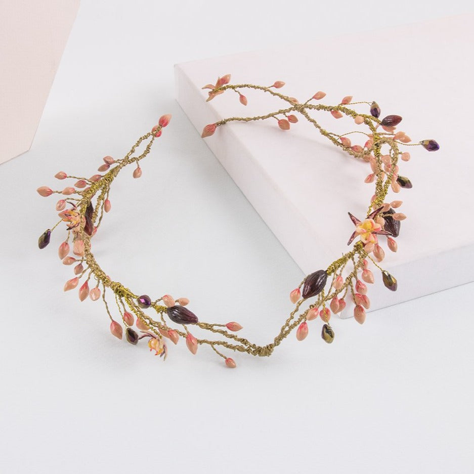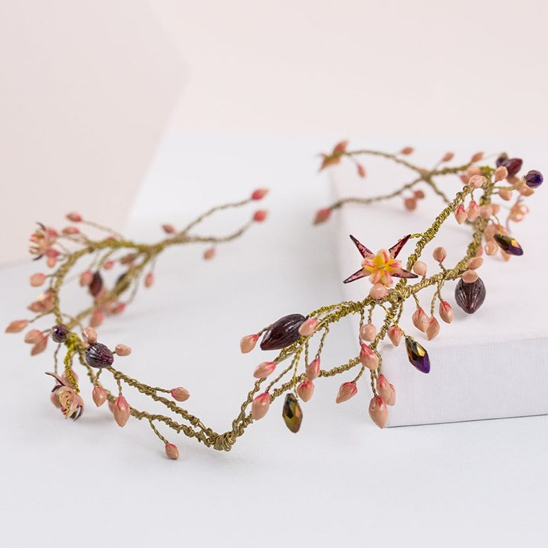 La estructura, lograda con hilos metálicos color dorado, tejen los elementos de la corona Aire de cao. Estos consisten en la imitación del florecimiento del cacao. Semillas y flores de cacao en color coral, púrpura y rosa palo y elaborados en porcelana de almidón de yuca y piedras de cristal. Puedes combinar esta hermosa corona rosa con un velo de tul seda y unos pendientes flor de cao.