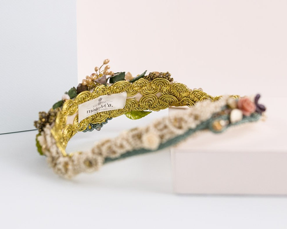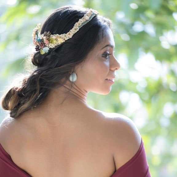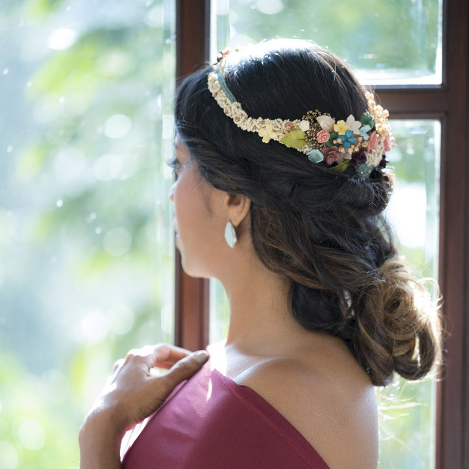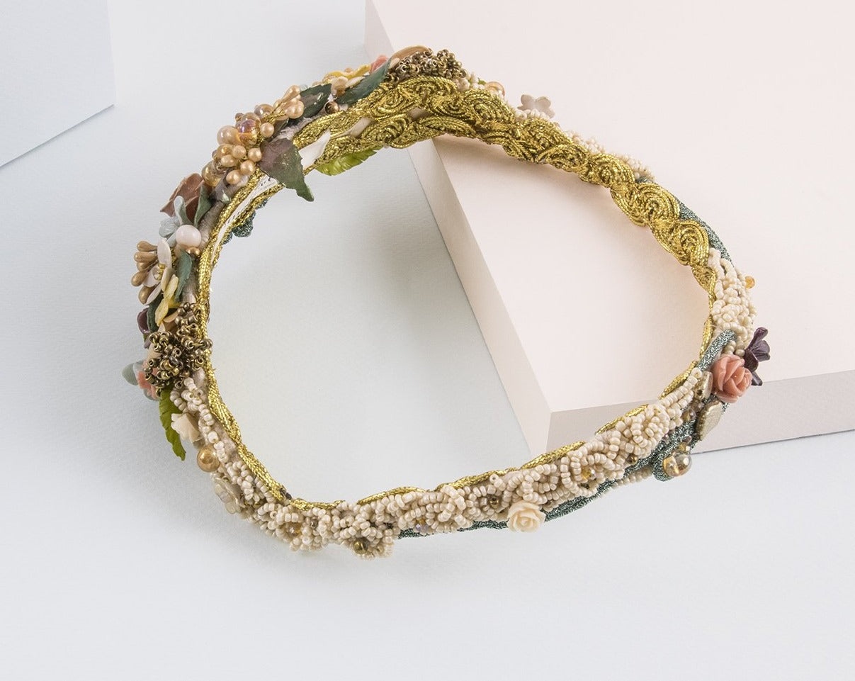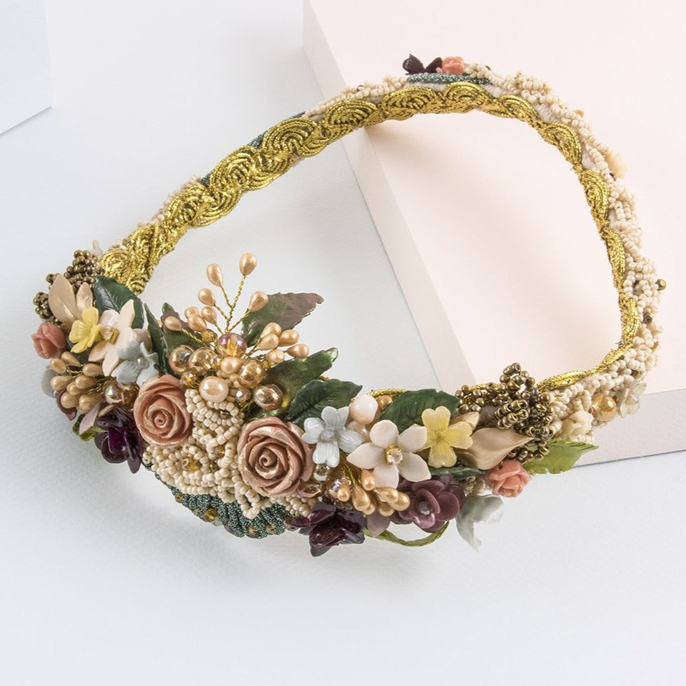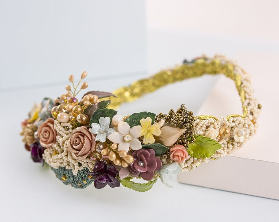 En esta corona multicolor destacan el dorado, rosa palo, crema, beige, verde oscuro, vino tinto y coral. Es una corona para grandes eventos, ideal para novias o invitadas. Este accesorio pone en evidencia tu gusto por la moda y belleza. Se ajusta cómodamente a la cabeza y lo puedes llevar con un peinado recogido en una trenza o moño.