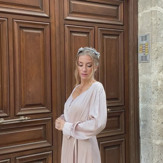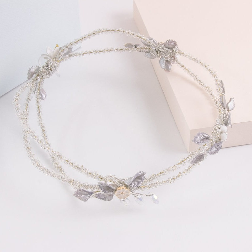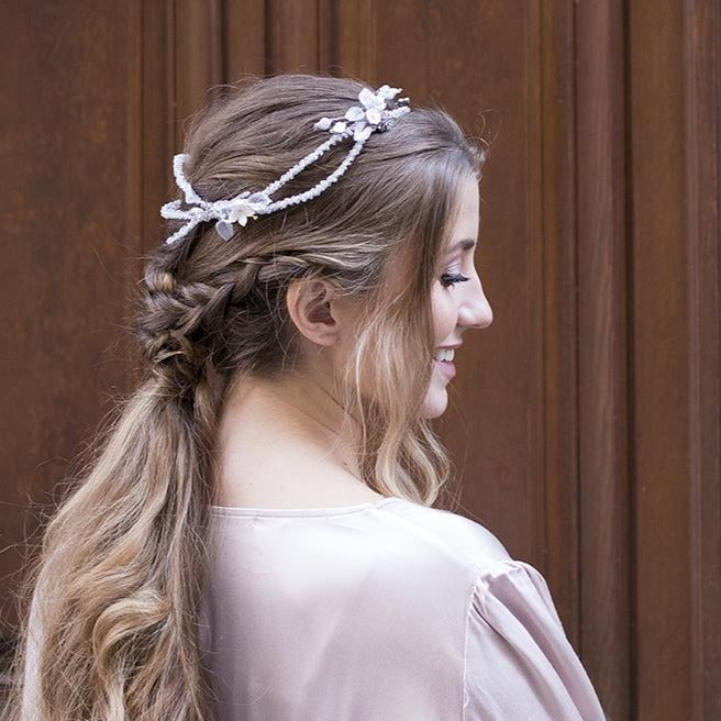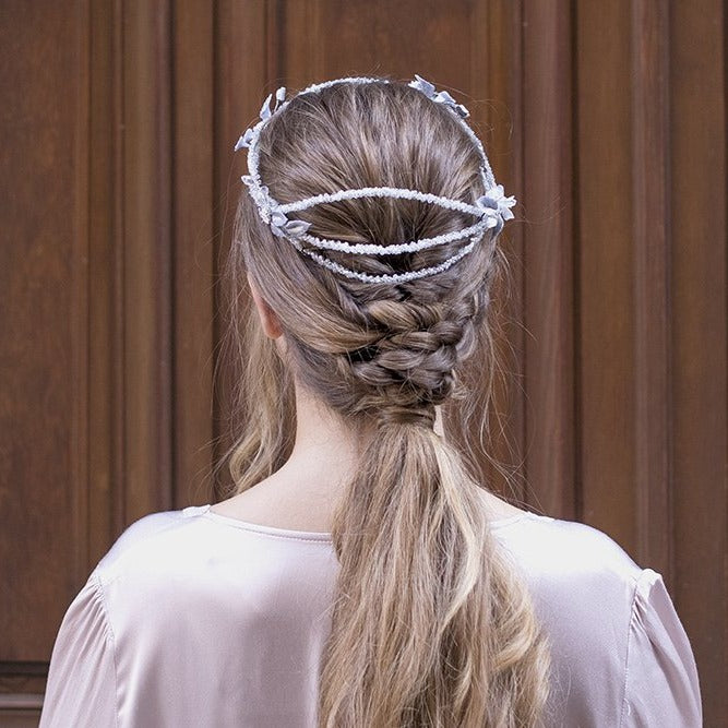 La medida de esta corona de plata es de 18 cm, un tamaño perfecto para que la puedas adaptar a tu peinado tanto si lo quieres recogido como semirrecogido. Combina esta corona blanca con los aretes largos de novia flor de cao y tendrás en conjunto perfecto.