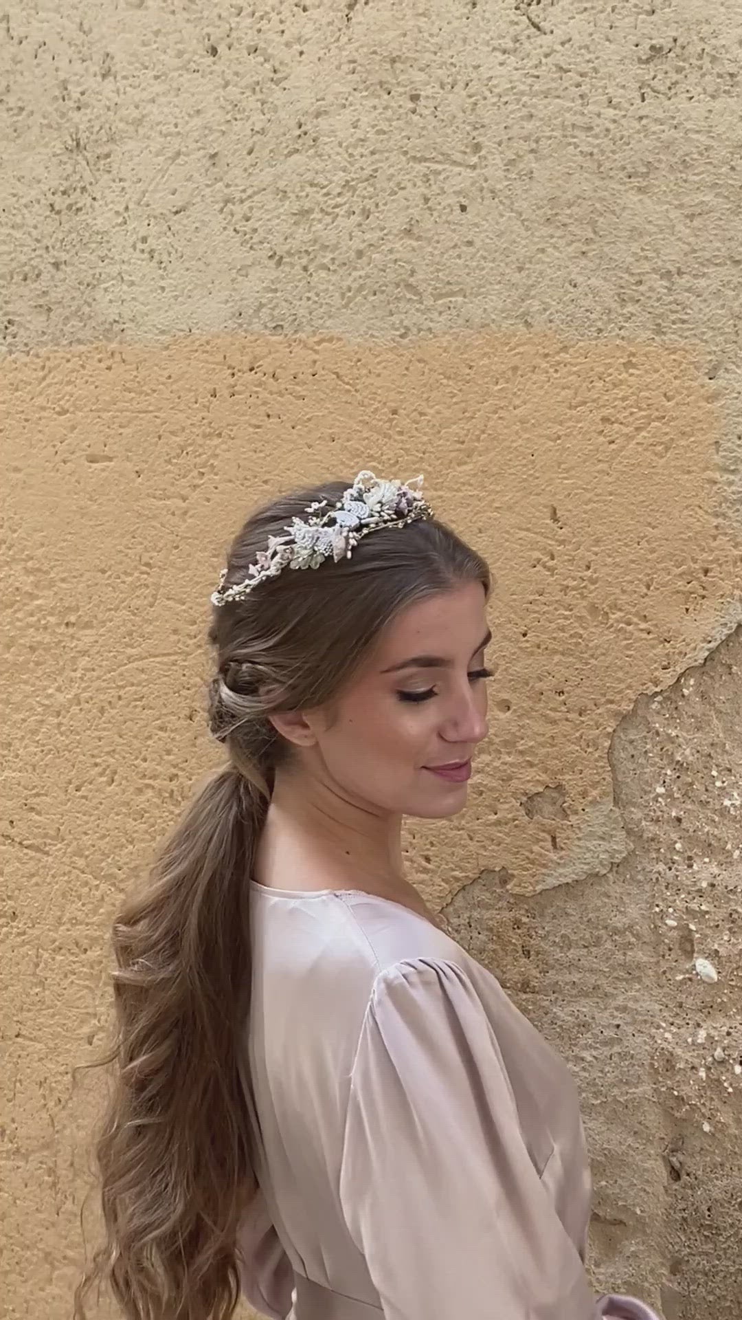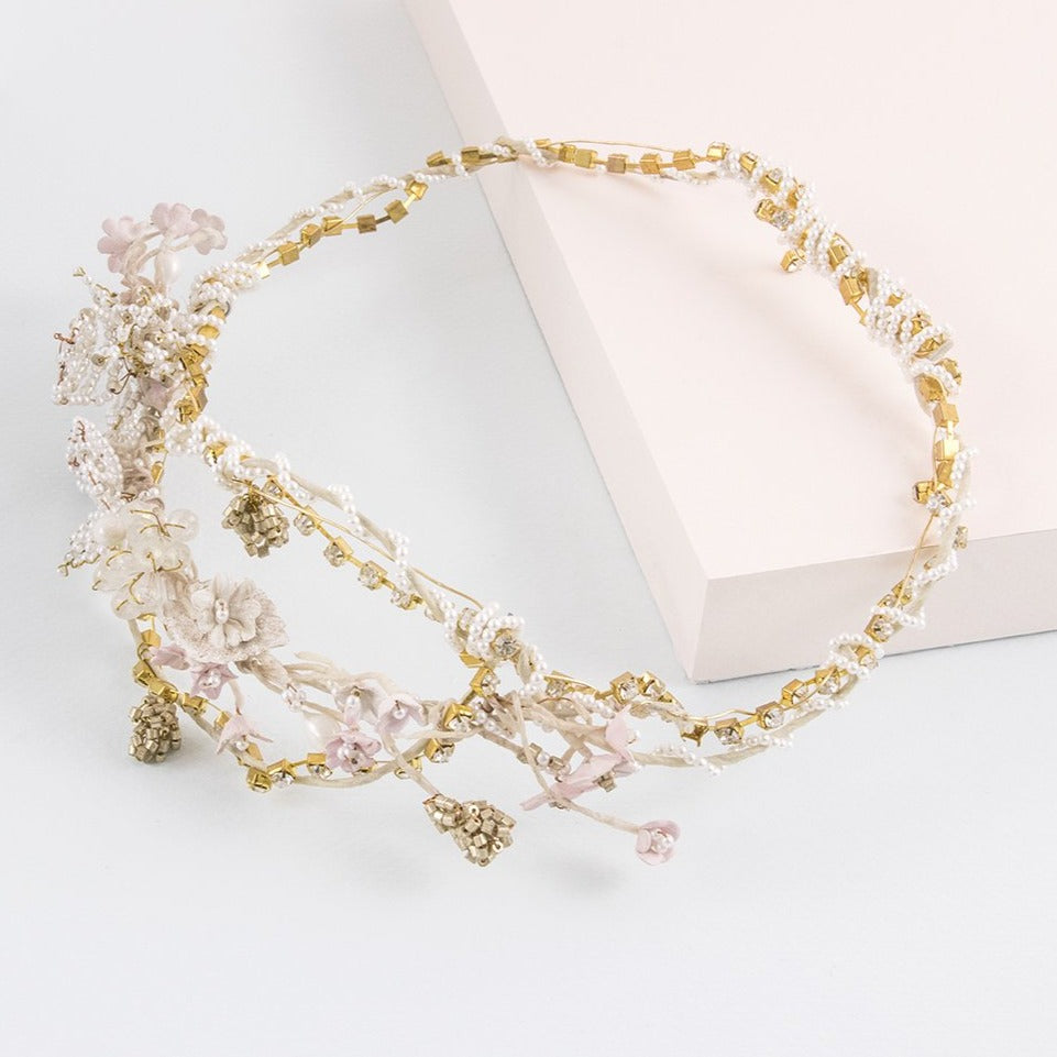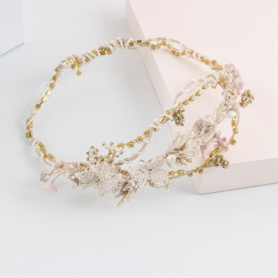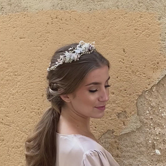 Los colores en la corona garden pertenecen a una paleta pastel. Las tonalidades beige, rosa palo y dorado harán que tu cabello derroche una tierna calidez a la vez que modernidad. Tu imagen y tu cabello experimentarán el encanto de la sutileza con esta corona de color blanco. La corona de oro es perfecta para lucir en una boda con unos aretes de largos de porcelana Heliconia oro.