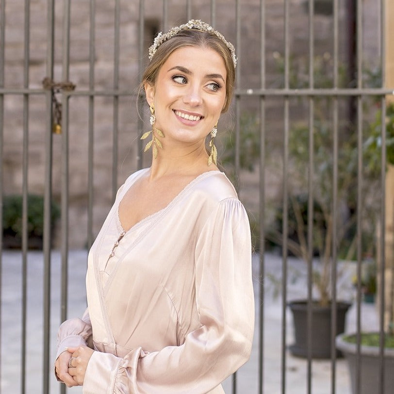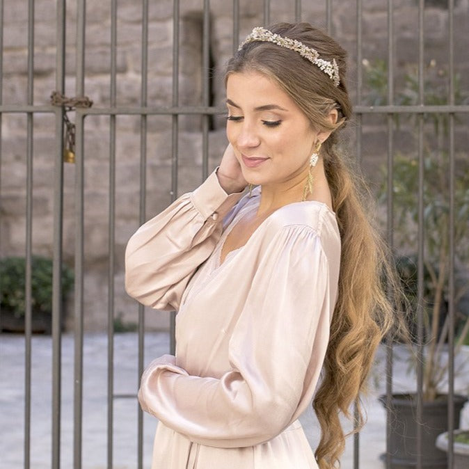 Esta diadema de oro viene en un tamaño mediano de 16 cm de diámetro y 2 cm de altura, la cual la convierte en un toque ligero y adaptable a muchos tocados. Combina a la perfección con pendientes largos, como los Acacia.