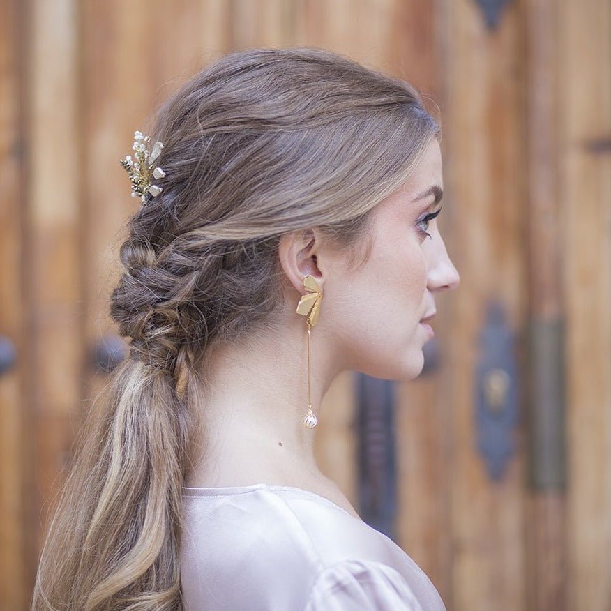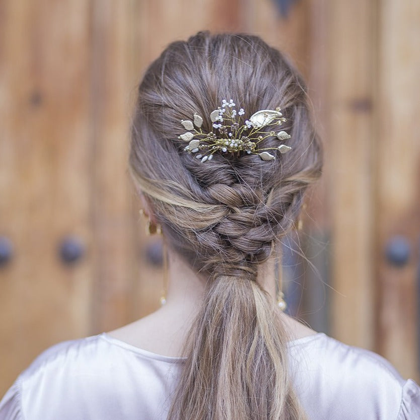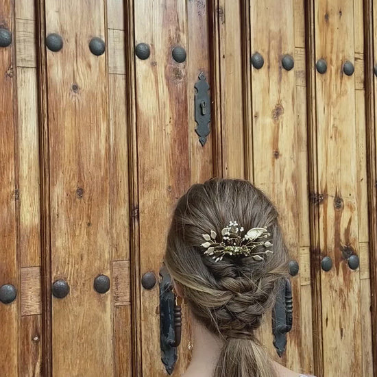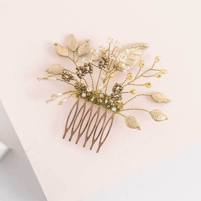El conjunto de elementos que la conforman dan carácter estético al diseño exclusivo de esta hermosa peineta color crema. Su tamaño, de 10 cm x 5 cm, es perfecto para que cumpla una función utilitaria y a la vez decorativa en tu pelo. Esta peineta color oro destacará mucho más si la combinas con unos pendientes espiga largos o cortos