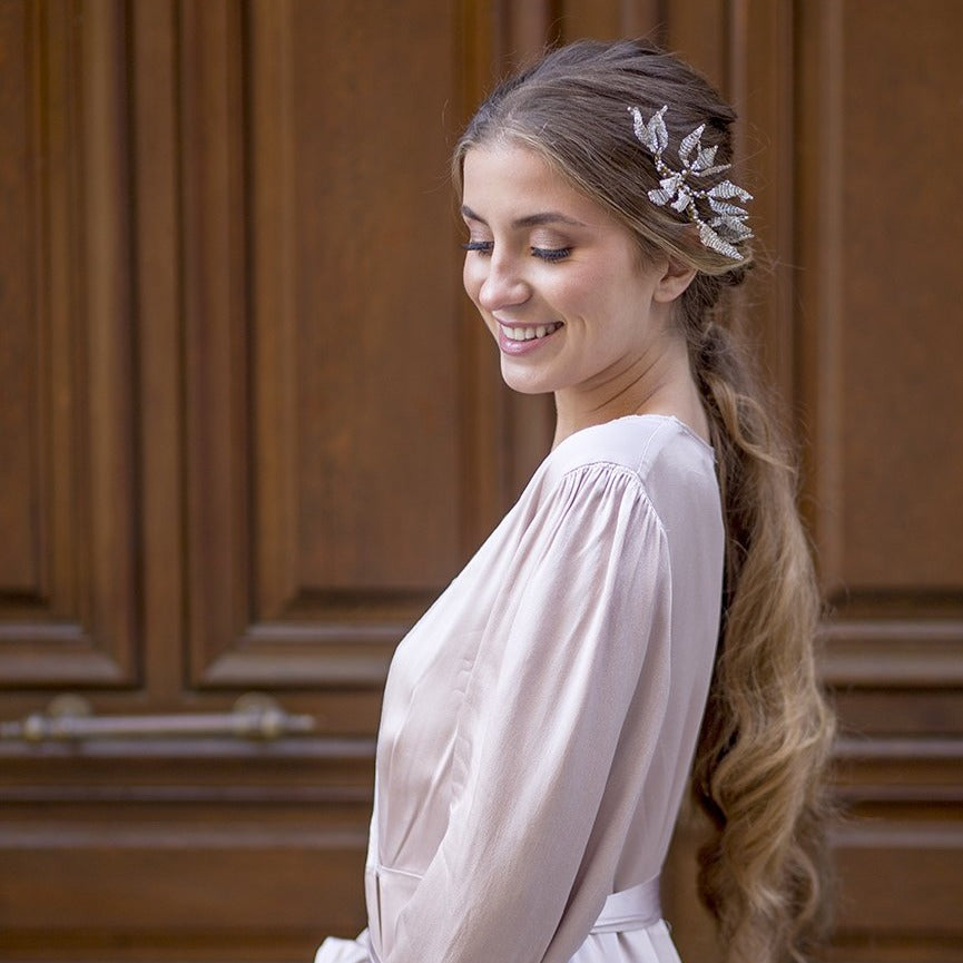 Si estás usando un vestido de noche, elige una peineta con un diseño exclusivo, como el de la peineta Orchid. Sujeta tu cabello con ella hacia atrás o hacia un lado. También puedes usar esta peineta en color blanco de 15 cm x 8 cm x 6 cm como adorno en un tocado o sombrero.