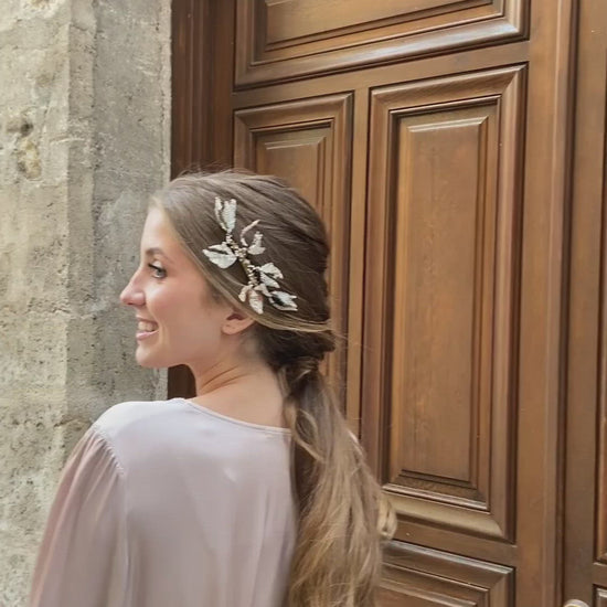 Llevar esta peineta en color oro le dará un aspecto elegante y sofisticado a tu conjunto gracias a su diseño en metal dorado, decorado con minipiedrecillas transparentes, perlas e hilo metálico. Esta peineta para ocasiones especiales la puedes llevar a juego con los pendientes Azucena.