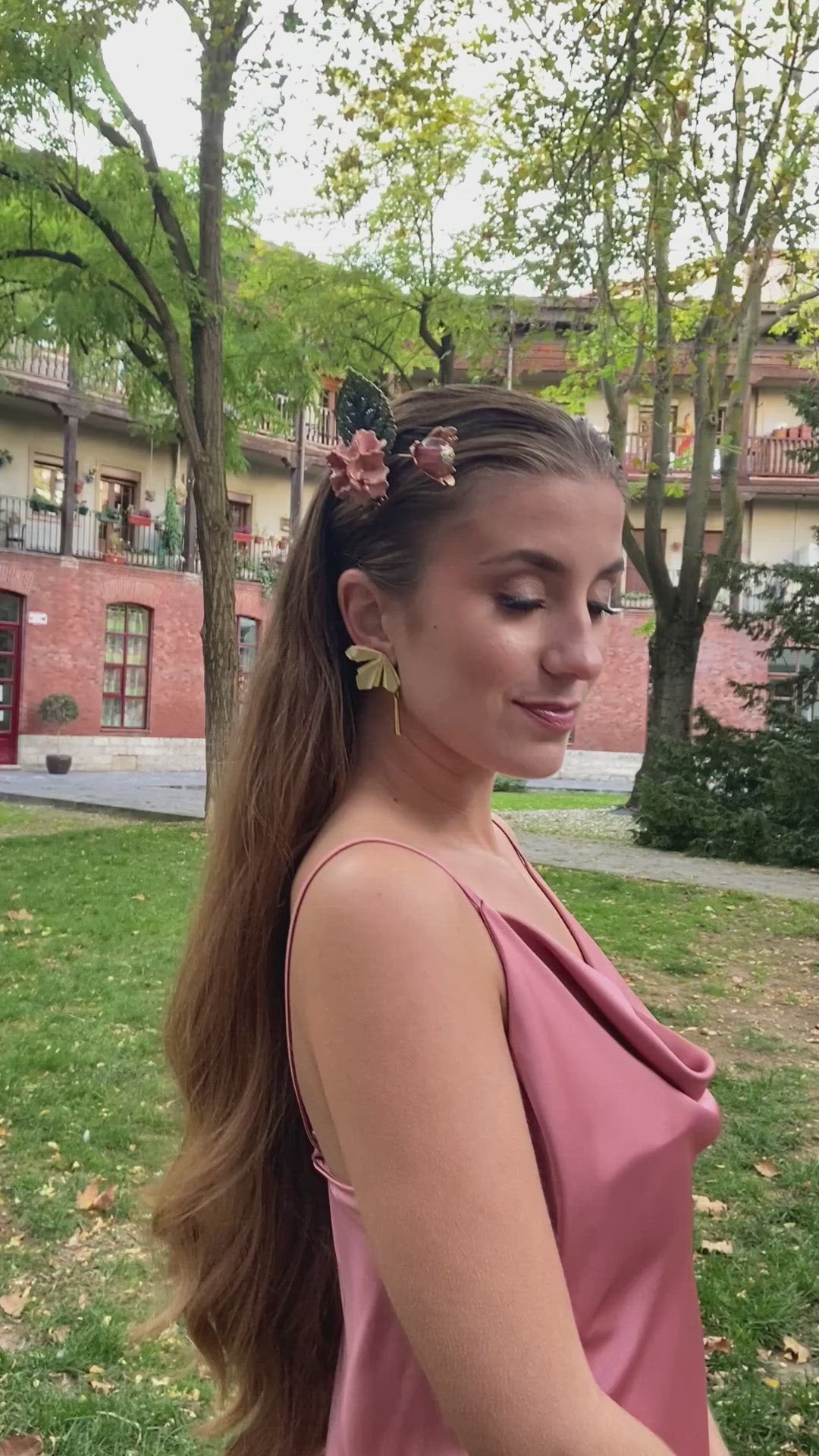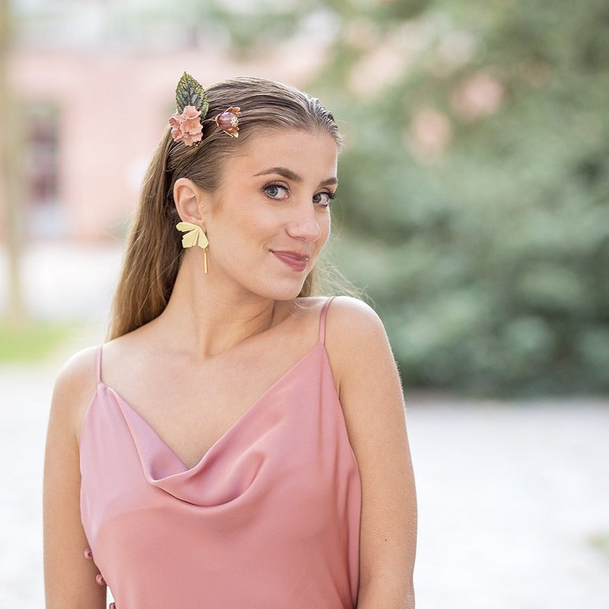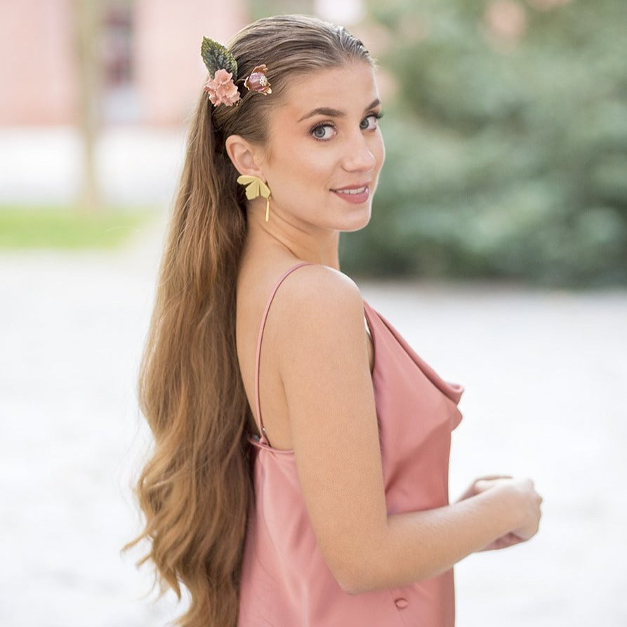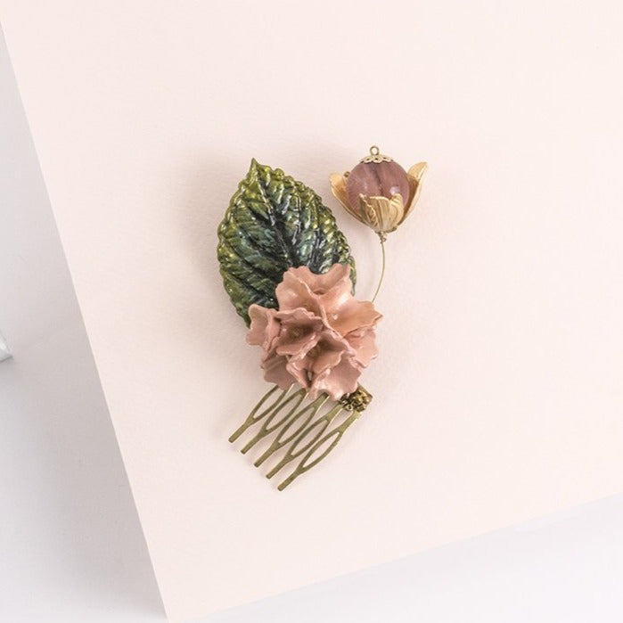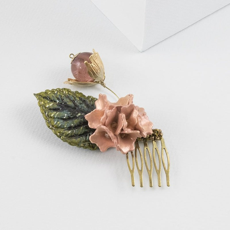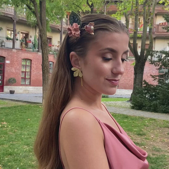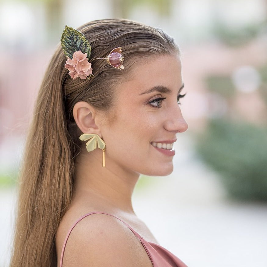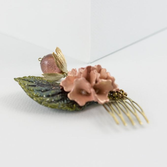 Destacan una hoja verde oscuro y una flor de porcelana color rosa palo. Finos hilos sostienen un capullo de flor de tabaco con una esfera transparente color rosa en su centro. Esta peineta salmón y oro es perfecta para llevarla en una ocasión casual o formal porque su diseño es versátil. La puedes combinar con los pendientes largos de espiga con lágrima oro.