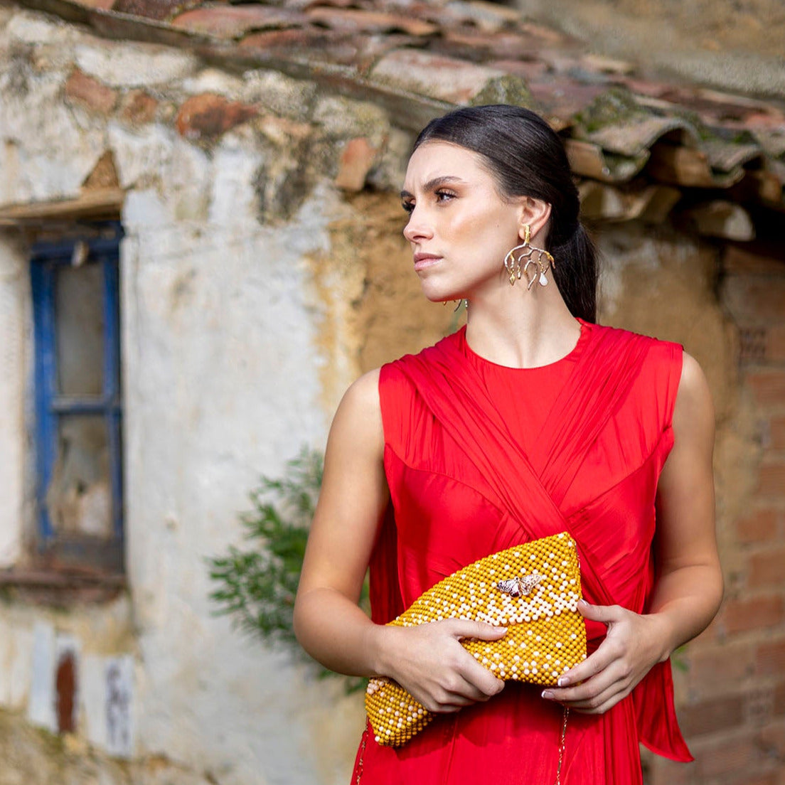 Los pendientes Mandragora poseen una estructura en orfebrería tradicional en bronce, chapada en oro de 24k, envuelta en porcelana de almidón de yuca. Este material sostenible permite que sean a prueba de golpes y duraderos. Estos pendientes grandes han sido pintados y moldeados a mano con una laminilla de oro. Son antialérgicos, firmes y ligeros. ¡Te dejaran en shock!