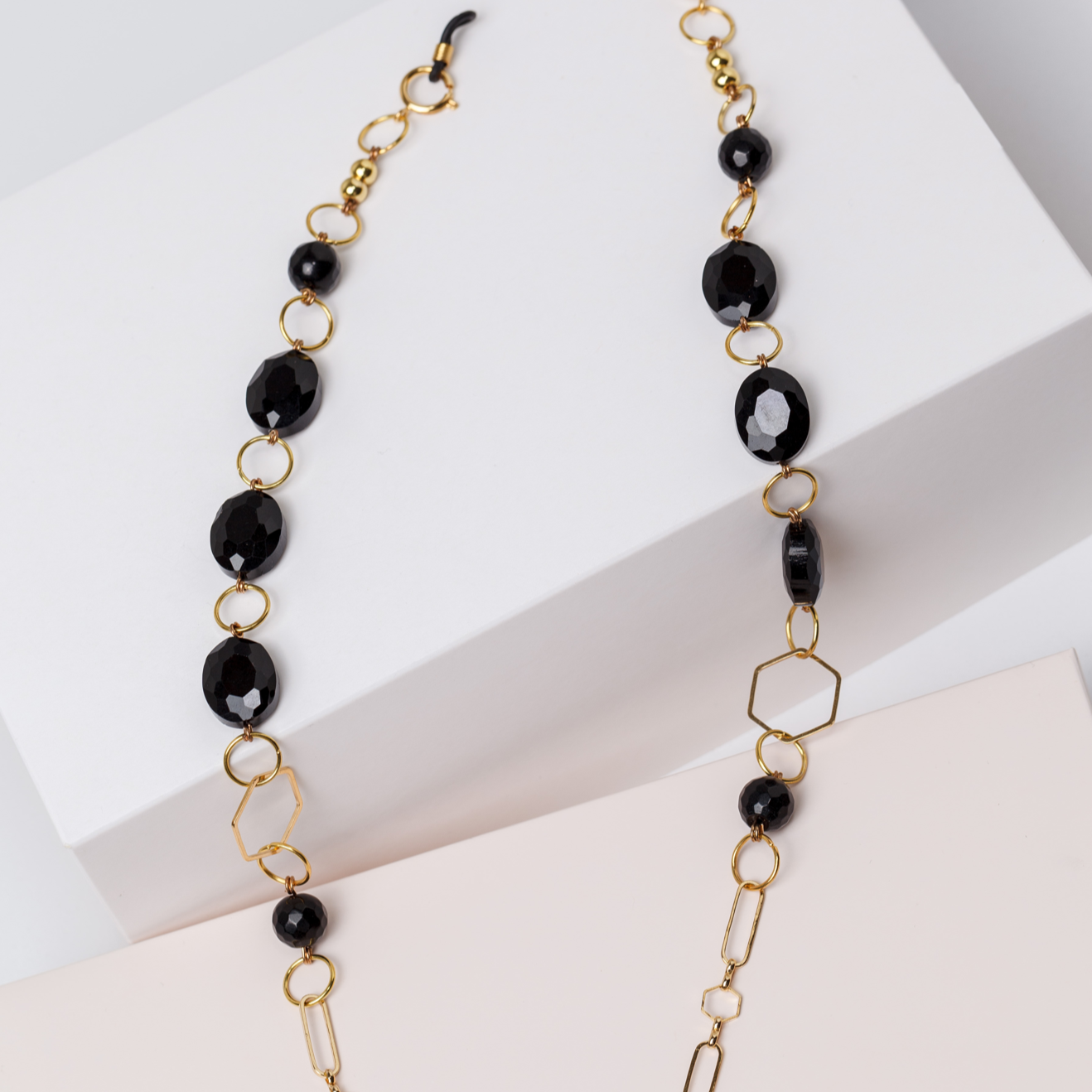 collar, cordones de gafas y sujeta tapabocas, los hicimos en Colombia, completamente a mano por Maria. Usamos una base de oro gold filled que aporta mas durabilidad, y el detalle más importante está en la cadena con eslabones diferentes en contraste con las figuras color negro. Es muy liviano.