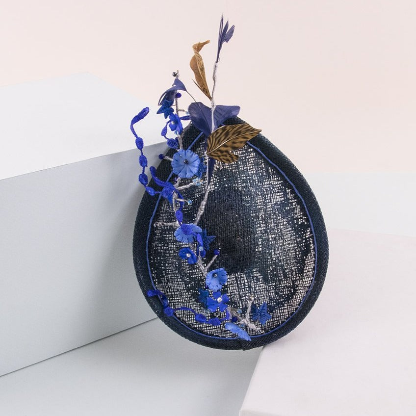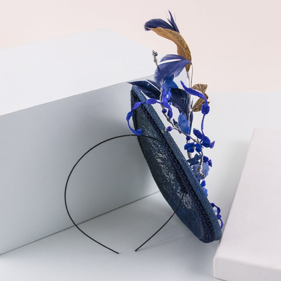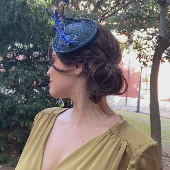 Este tocado azul de casquete es una opción versátil que puede adaptarse a diferentes ocasiones. Lo puedes realzar con los pendientes topo Flor de Cao del mismo color.