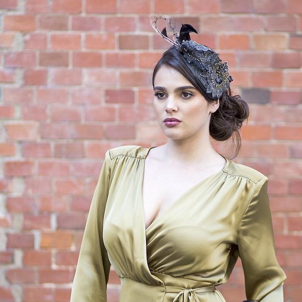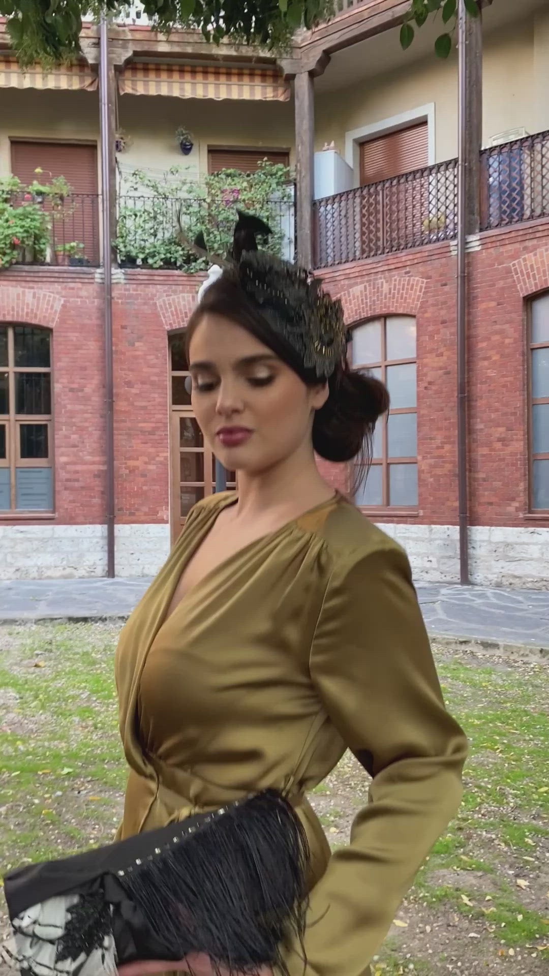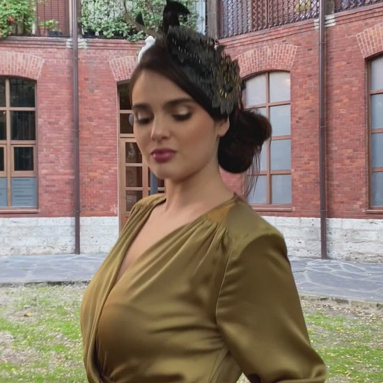 Este tocado de invitada lo diseñó y fabricó a mano Juliana en el atelier Misia & Co. de España.