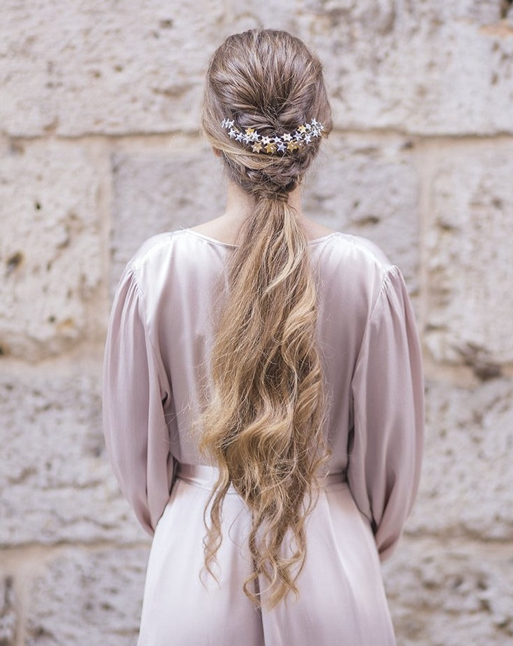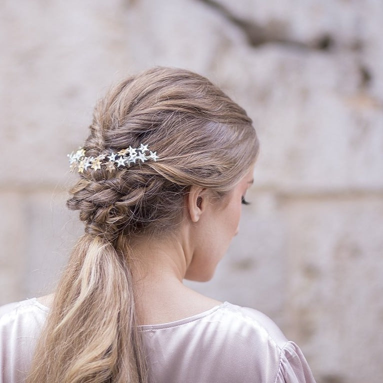 El tocado de estrellas está elaborado en una fina estructura metálica sobre la que se tejen hileras de estrellas en color dorado y plata. Cada estrella de este tocado oro lleva en su centro una piedrecilla de porcelana color perla.