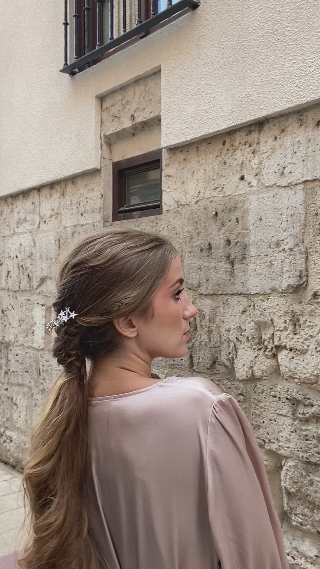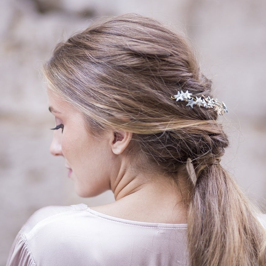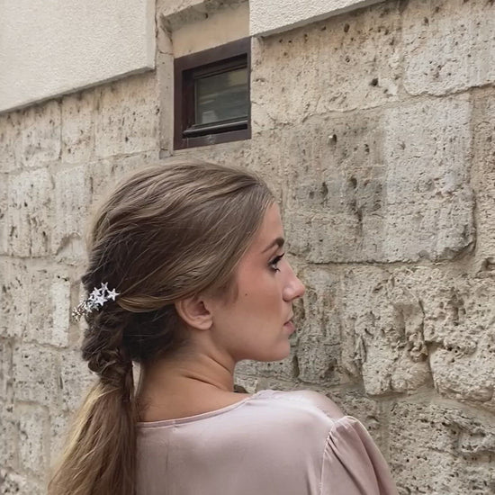 Este tocado plata es perfecto para mujeres y niñas que quieren brillar en una boda o en otras ocasiones casuales. Puedes combinar esta peineta con los delicados pendientes pequeños Aire oro.