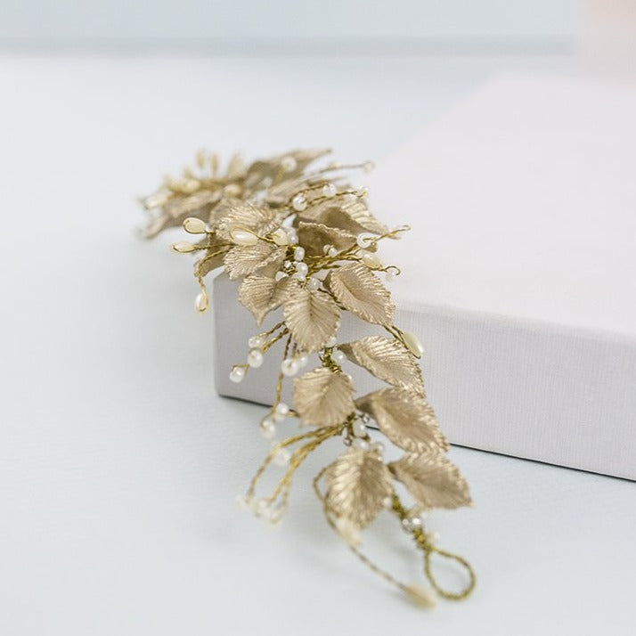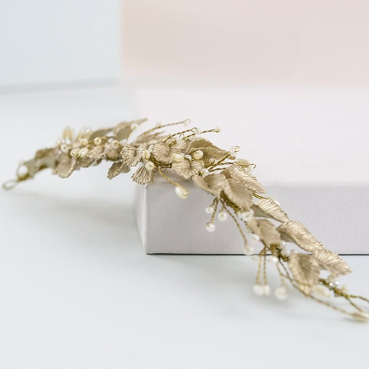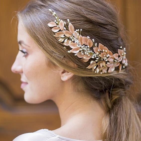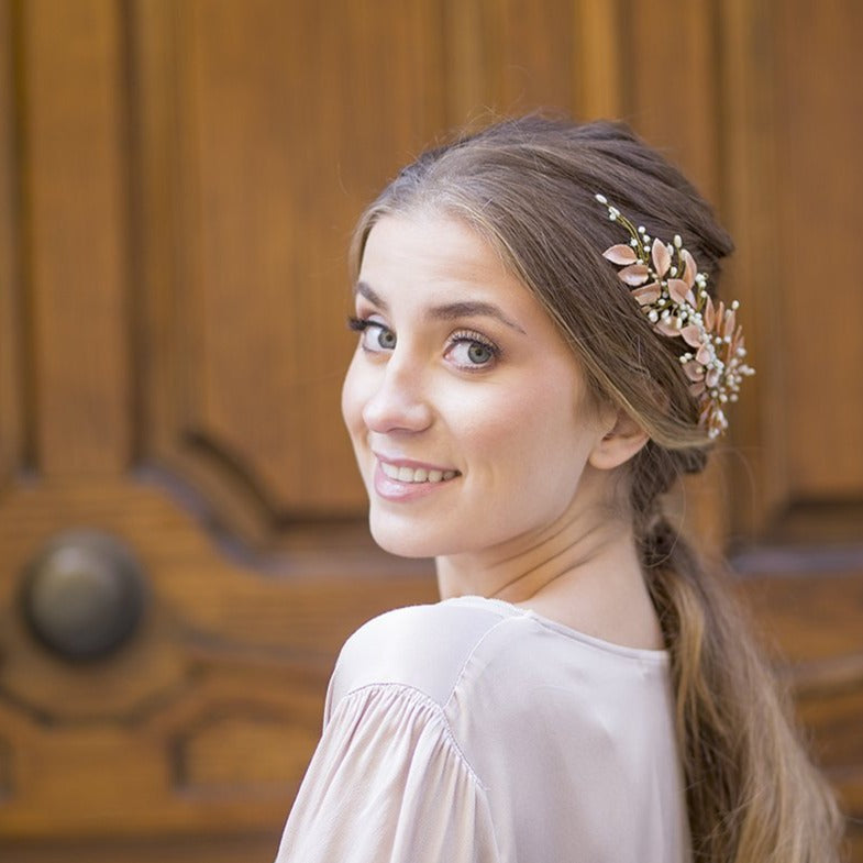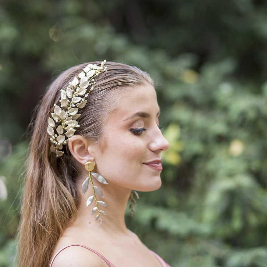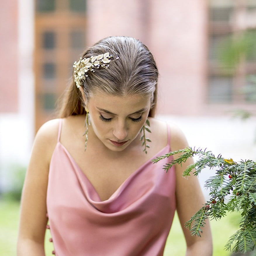 El tocado Rama de árbol está fabricado con una base metálica cubierta en finos hilos dorados. Estos entretejen delicadamente las hojas de porcelana color pastel y los pistilos elaborados con piedrecillas color perla.