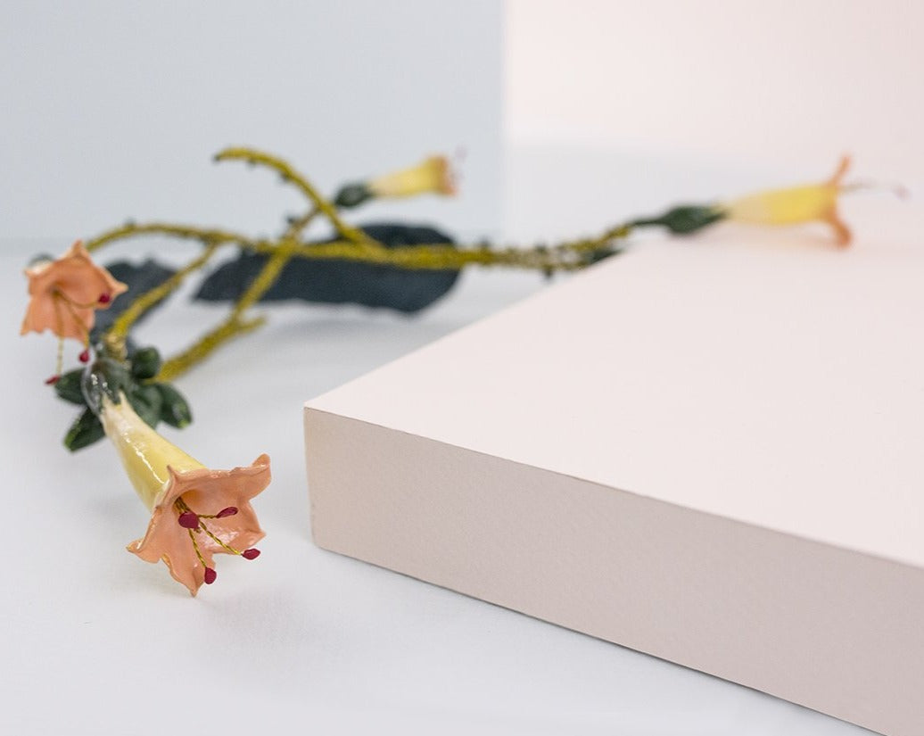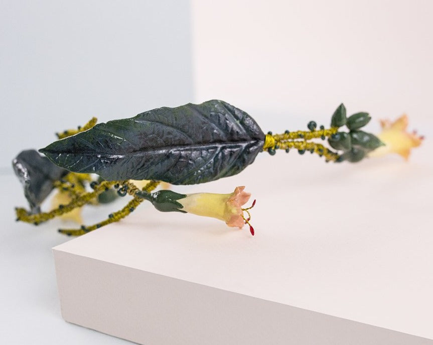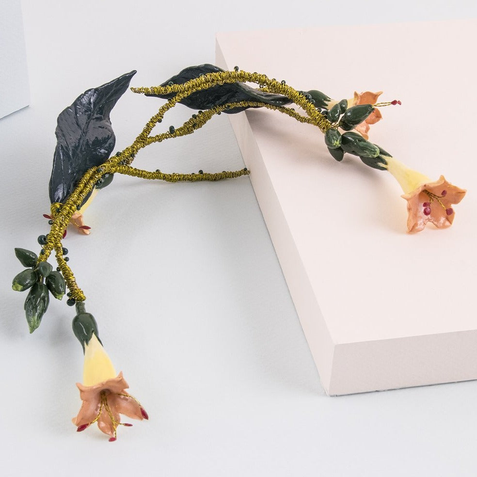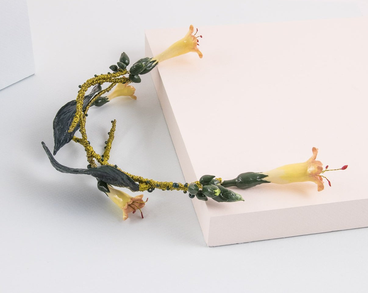 Este tocado de porcelana se caracteriza por su colorido llamativo en el que se combinan verde oscuro, beige, crema, coral, nude y dorado. Se llama tocado Tabaquera porque lo adornan preciosas flores en forma tubular, propias de la planta de tabaco. Estas flores y hojas, entretejidas con hilo dorado, están elaboradas en fina porcelana de almidón de yuca, moldeada y pintada a mano.