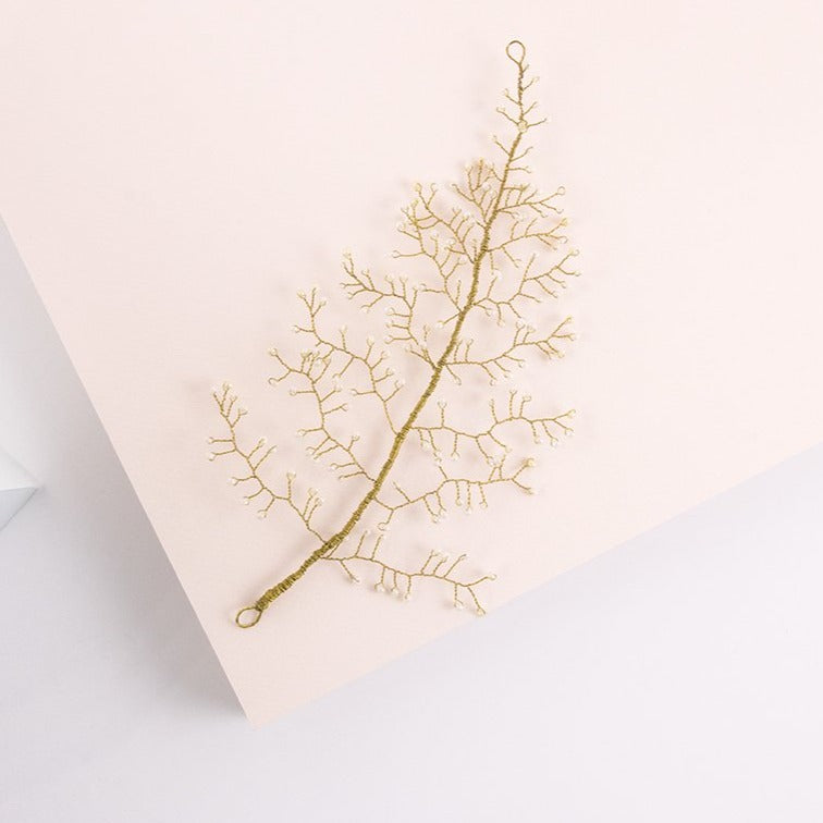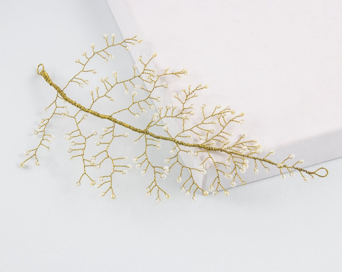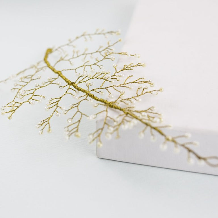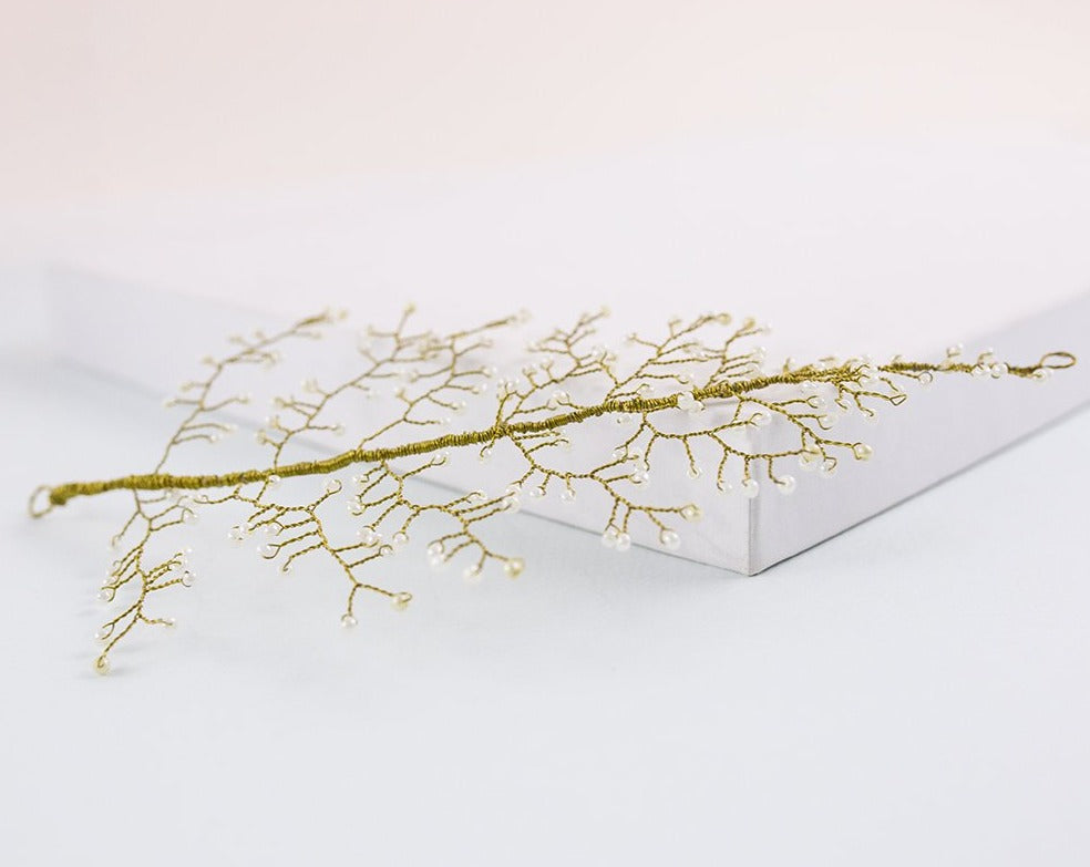 El tocado martinica es un accesorio que tiene un diseño original muy vistoso. Se trata de un tocado color oro, bordado a mano con finos hilos metálicos, que conforman una hoja lanceolada de 10 cm de ancho y 22 cm de largo. Las nervaduras de la hoja de este tocado joya están logradas con diminutas piedrecillas de poliéster en color perla, que realzarán tu peinado en una ocasión especial.